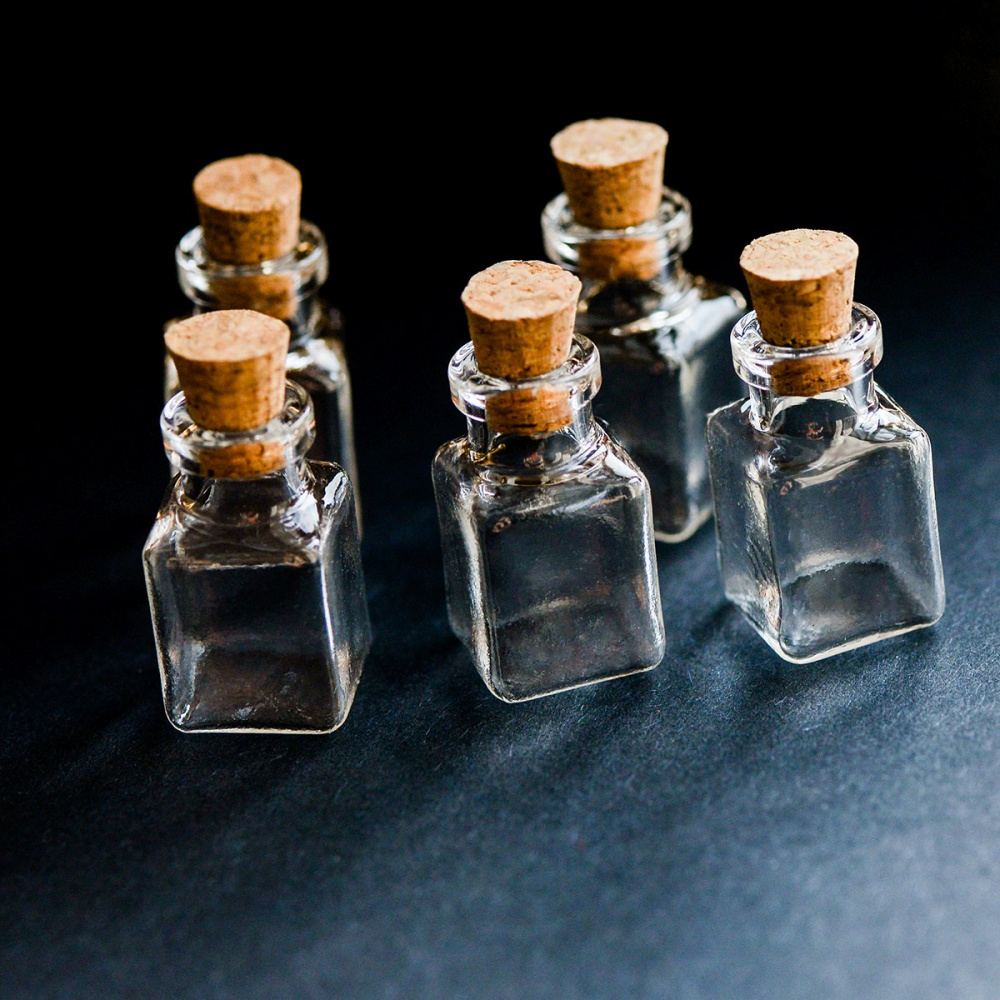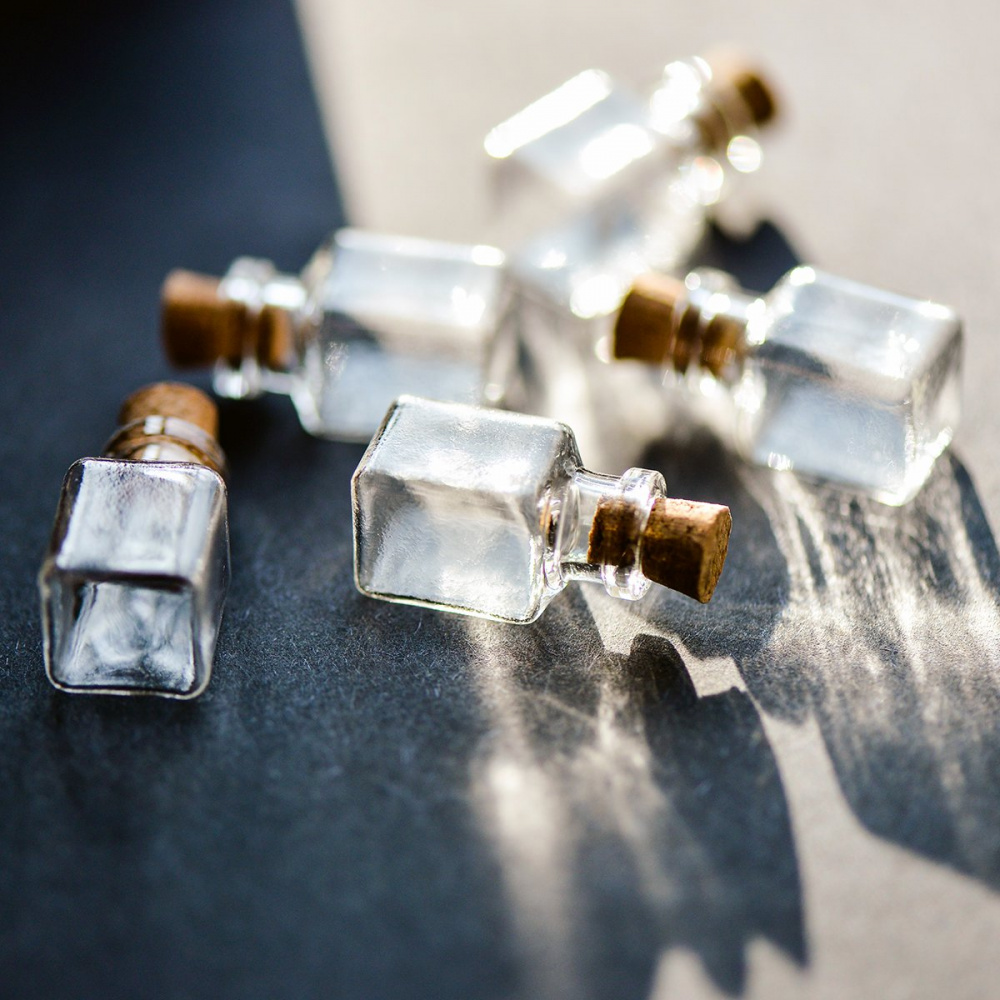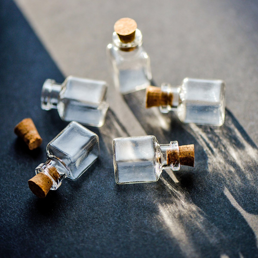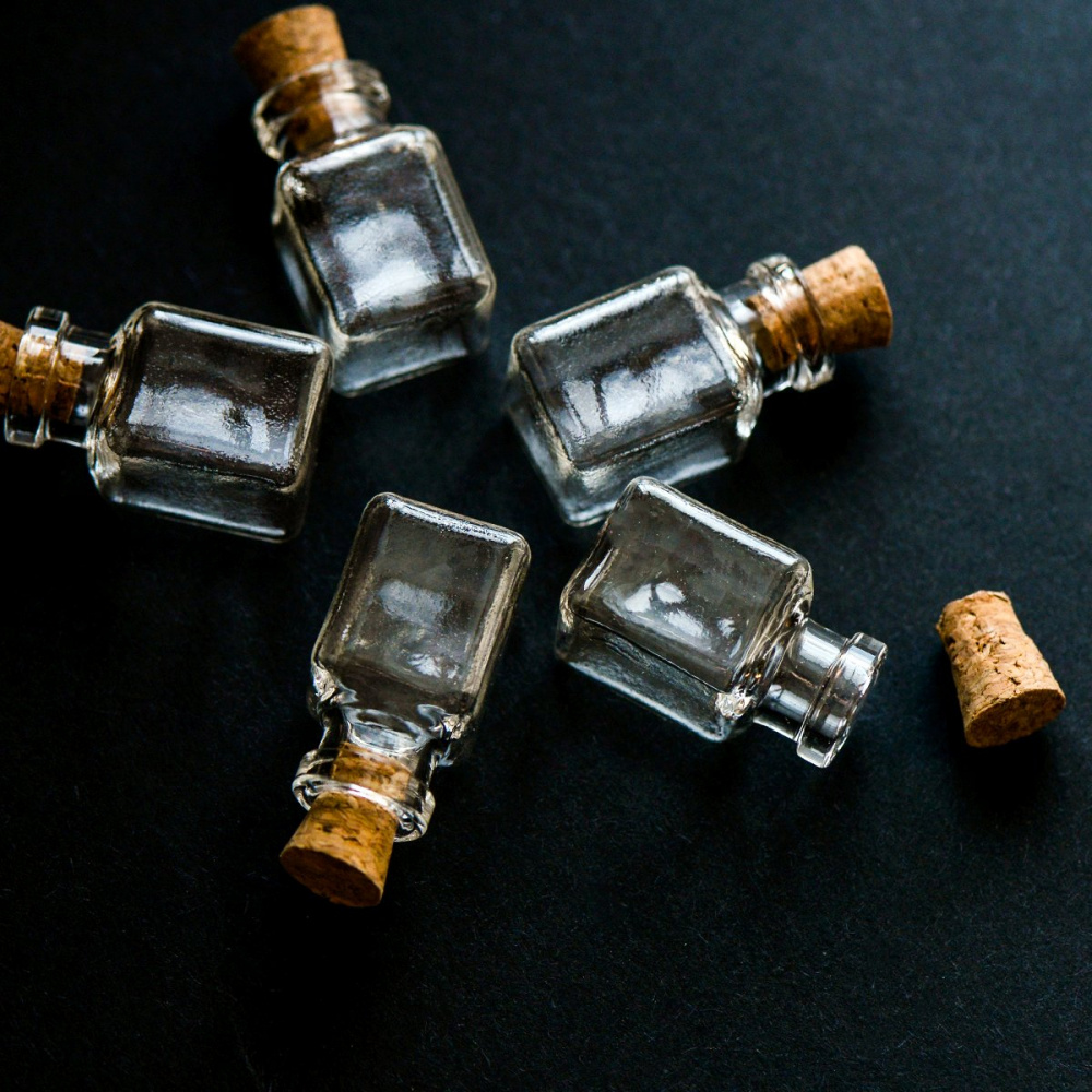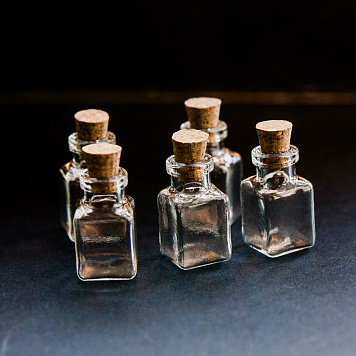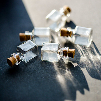 Маленькая стеклянная бутылочка с пробкой, прозрачная.