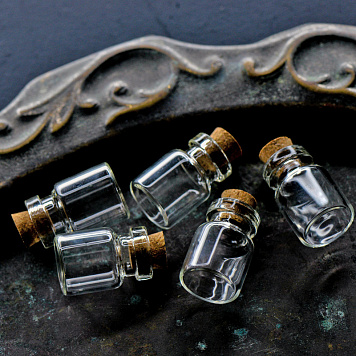 Маленькая стеклянная бутылочка с пробкой, прозрачная.
