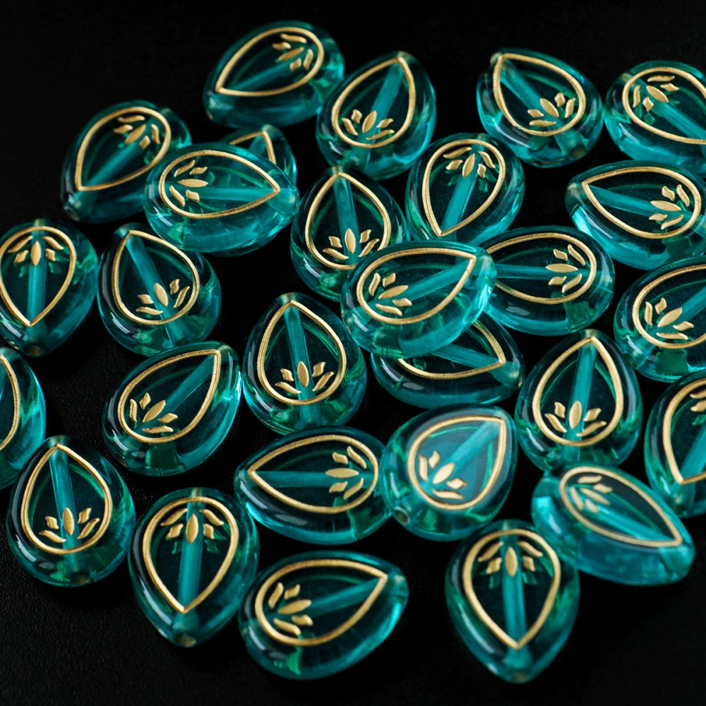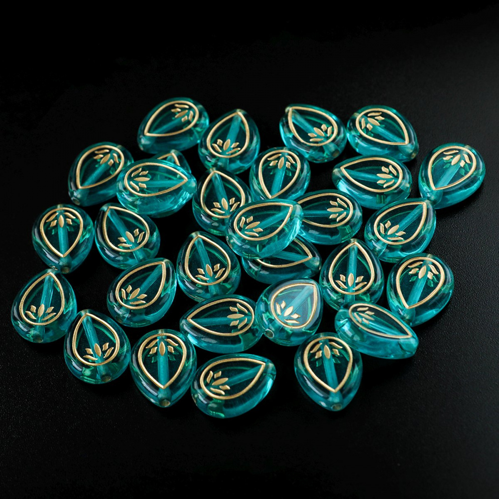 Бусина-капля плоская с печатным декором, изготовлена из акрила. Металлизированная патина золотистого цвета.