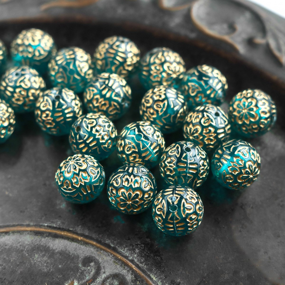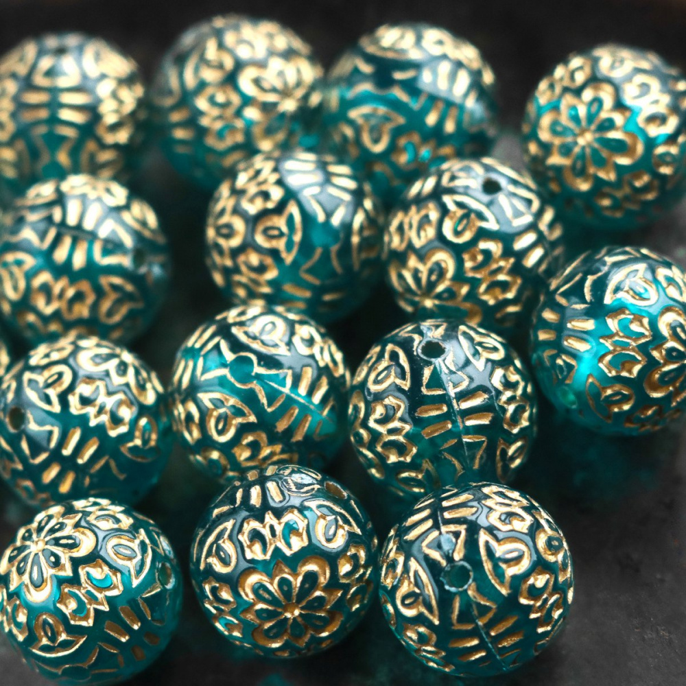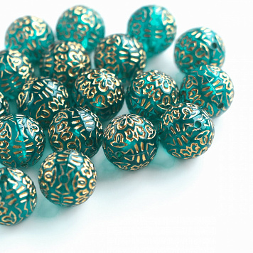 Бусина круглая с печатным декором, изготовлена из акрила. Металлизированная патина золотистого цвета.