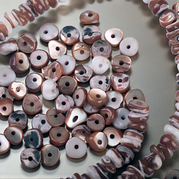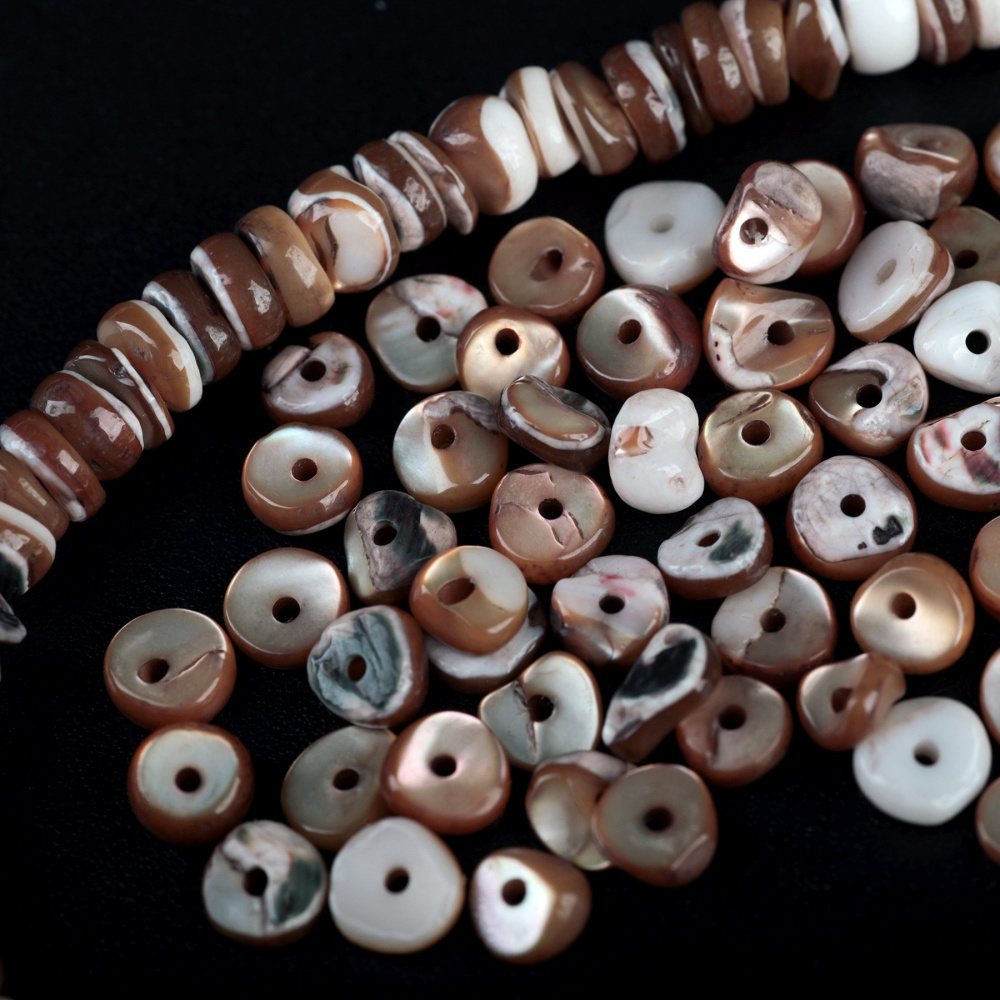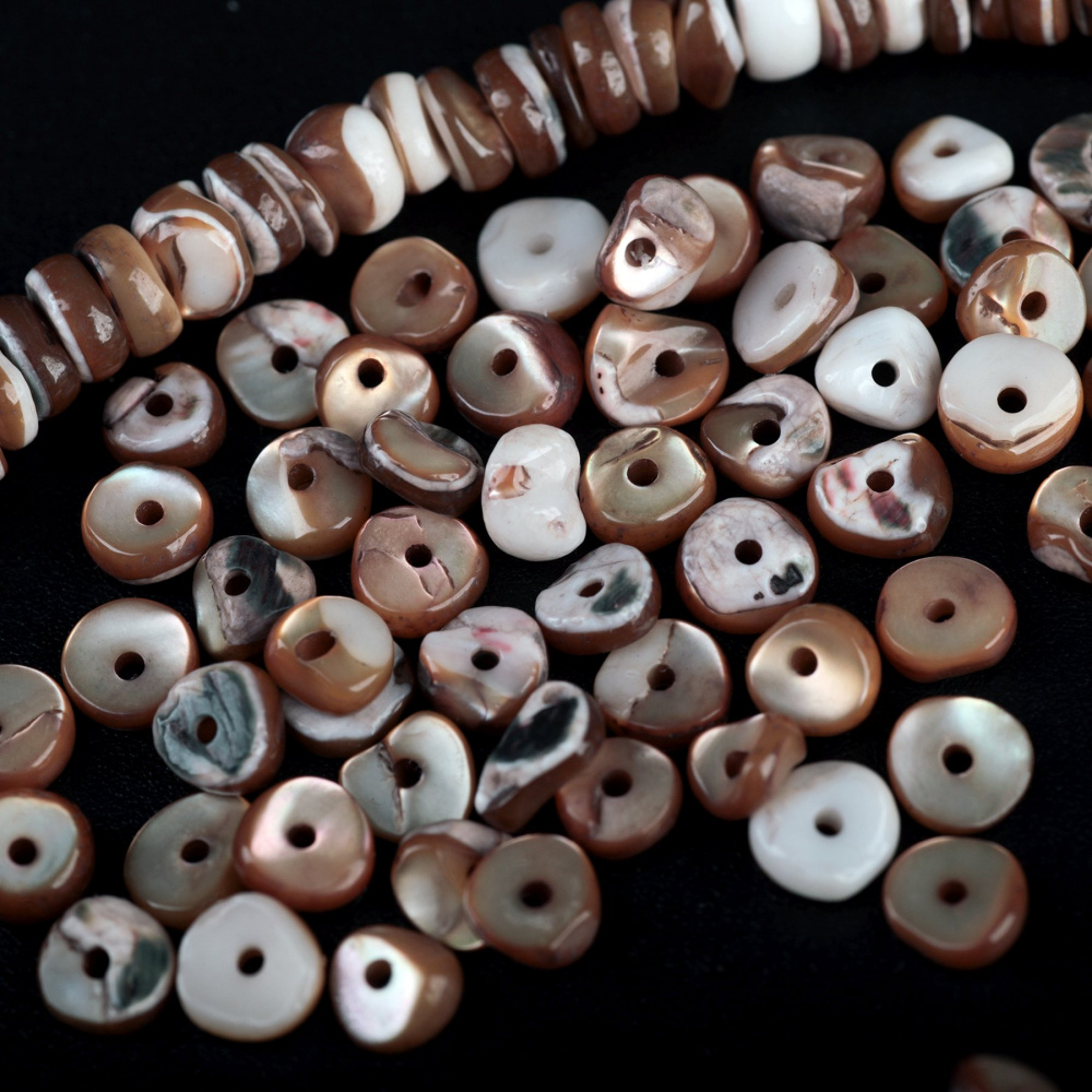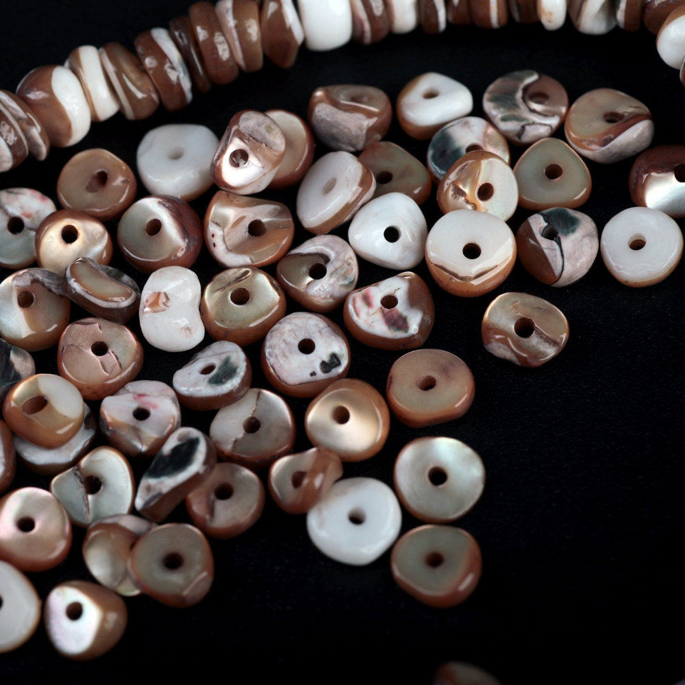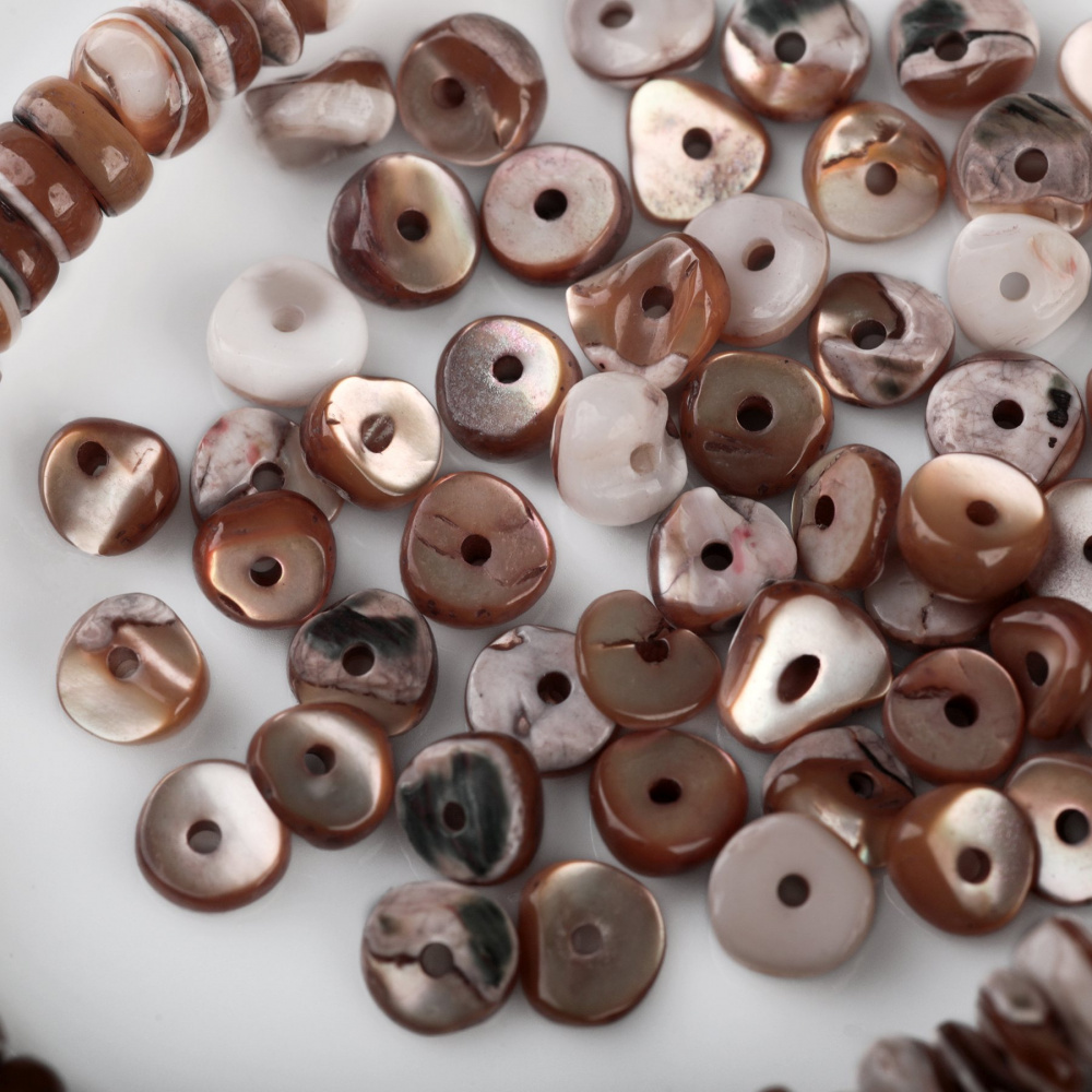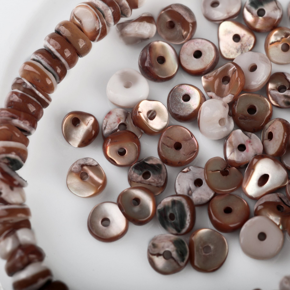 Натуральный природный материал, гармонично сочетаются с жемчужными, деревянными, каменными и ажурными металлическими бусинами. Бусины из ракушки подходят для создания элегантных украшений в средиземноморском, бохо, этно стилях.