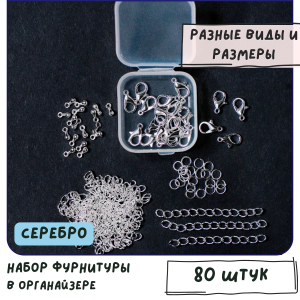 Набор фурнитуры для создания/ремонта бус и сережек, цвет серебро в органайзере
