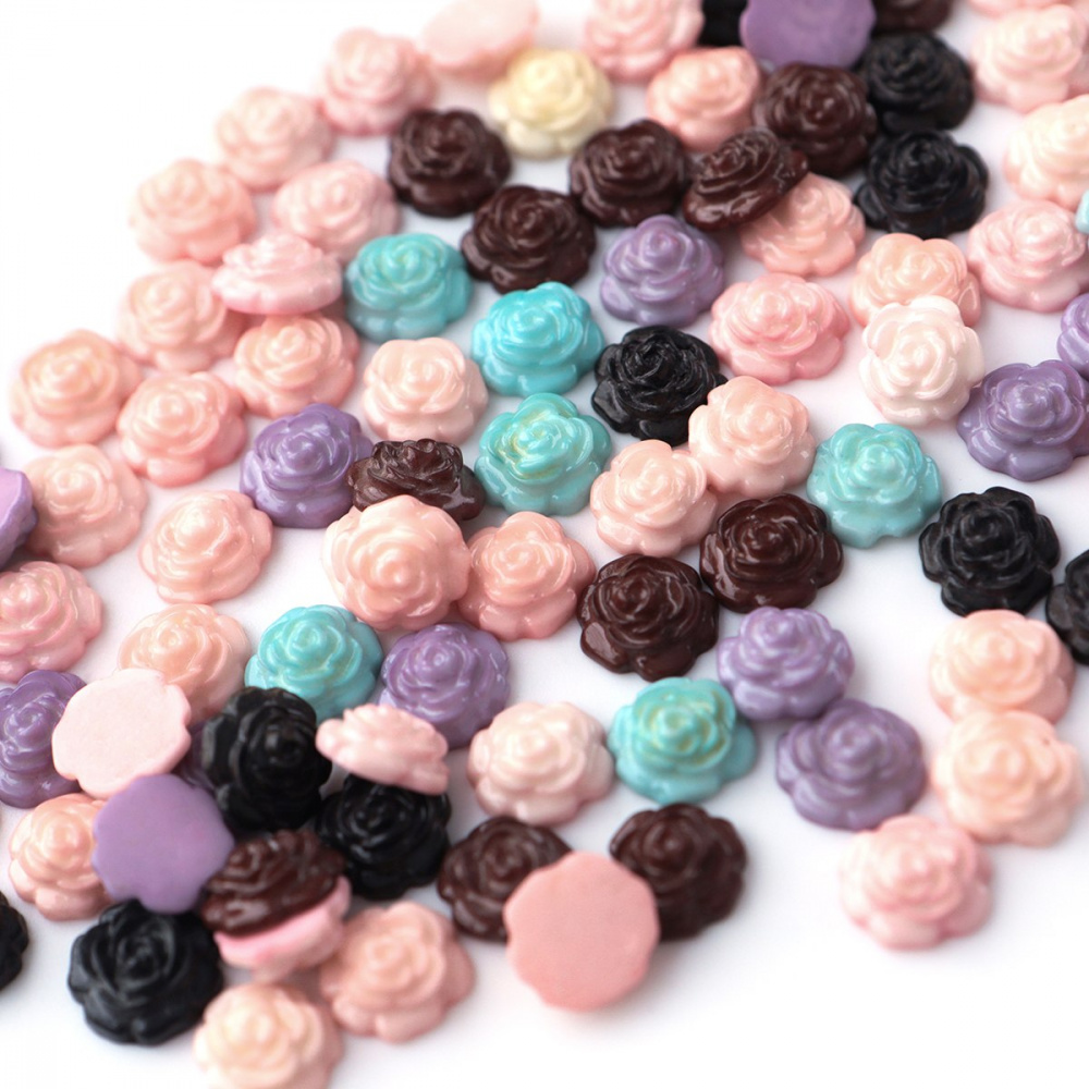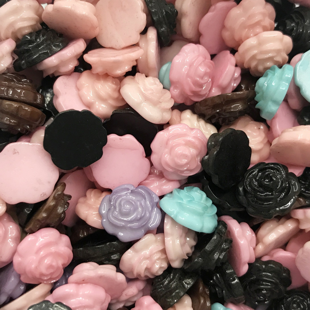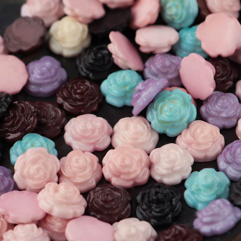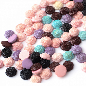 Кабошоны "Розочка" изготовлены из акрила разных цветов. Выберите свой цвет: желтый, розовый, бледно-розовый, бледно-сиреневый, бирюзовый, коричневый или черный.