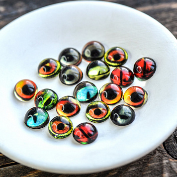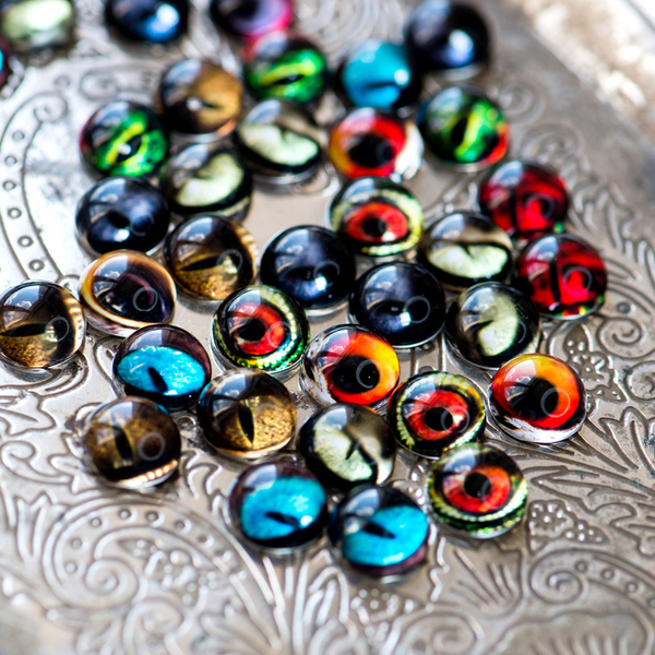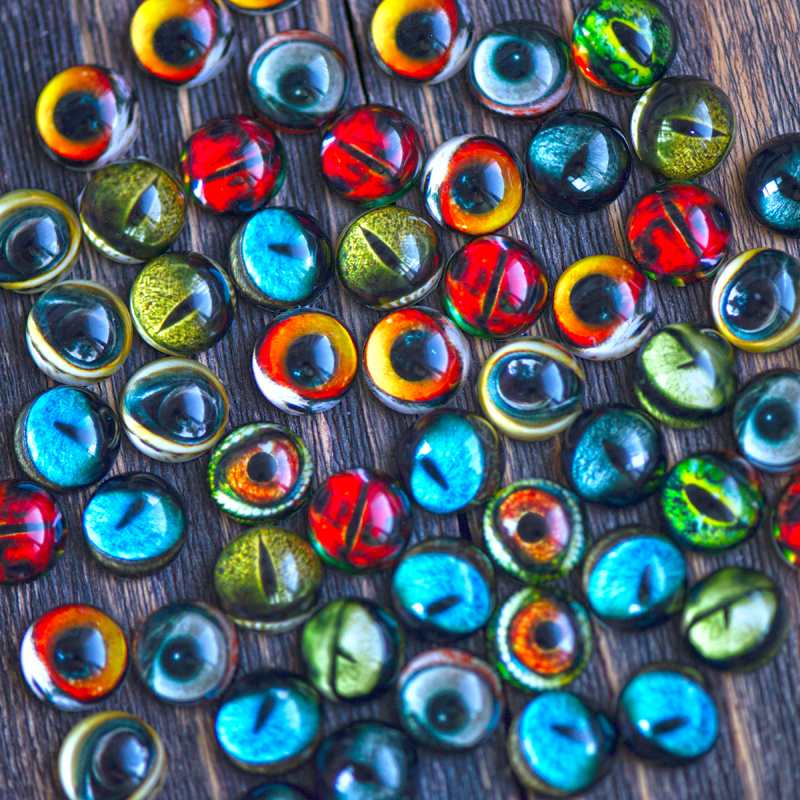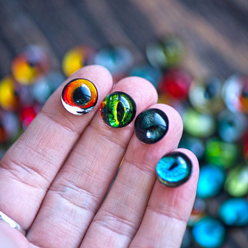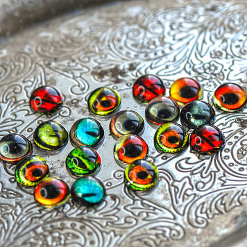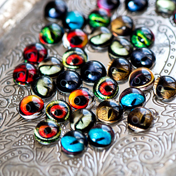 Круглый стеклянный кабошон с принтом в виде глаз птиц и животных. Зрачки, которые находятся сбоку, все смотрят в одну сторону.