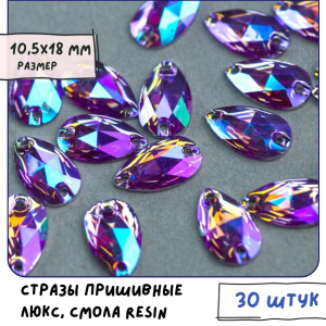 Стразы пришивные Teardrop, смола, аметист АВ, 10.5х18 мм
