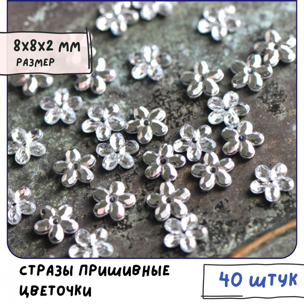 Пришивные акриловые стразы с плоским основанием в форме незабудки (без клея) широко используются для украшения одежды и аксессуаров. Легкие, не утяжеляют изделие. Вам не нужен паяльник для камней, стразы надежно крепятся к ткани простым пришиванием.